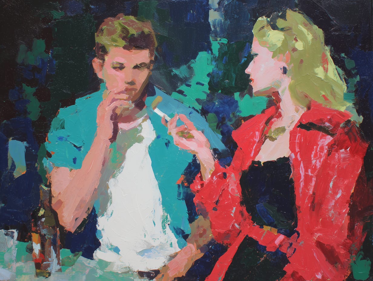After we get dressed, Alice smokes a cigarette on the unmade bed, and this time I take one. I watch our shadows on the wall. She lights a cigarette like a silent film goddess. There is something so confident about the flick of her wrist.